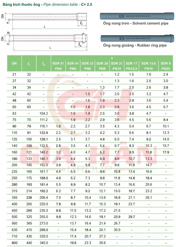 Kích Thước Ống uPVC Tiền Phong Hệ Mét