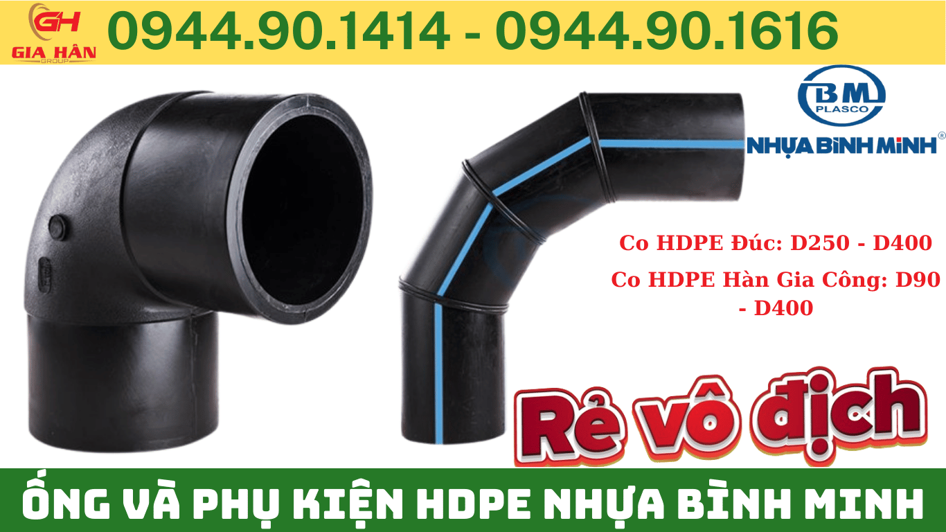 - Co HDPE (High-Density Polyethylene) là phụ kiện dùng để nối các đoạn ống nhựa HDPE đường kính danh nghĩa D110mm lại với nhau và tạo một góc cong nhất định, thường là 90° hoặc 45°. Phụ kiện co HDPE D110 Bình Minh được sản xuất bởi Công ty Cổ phần Nhựa Bình Minh, một thương hiệu uy tín hàng đầu trong ngành ống nhựa tại Việt Nam. Sản phẩm được sản xuất trên dây chuyền công nghệ hiện đại, đáp ứng các tiêu chuẩn chất lượng khắt khe.