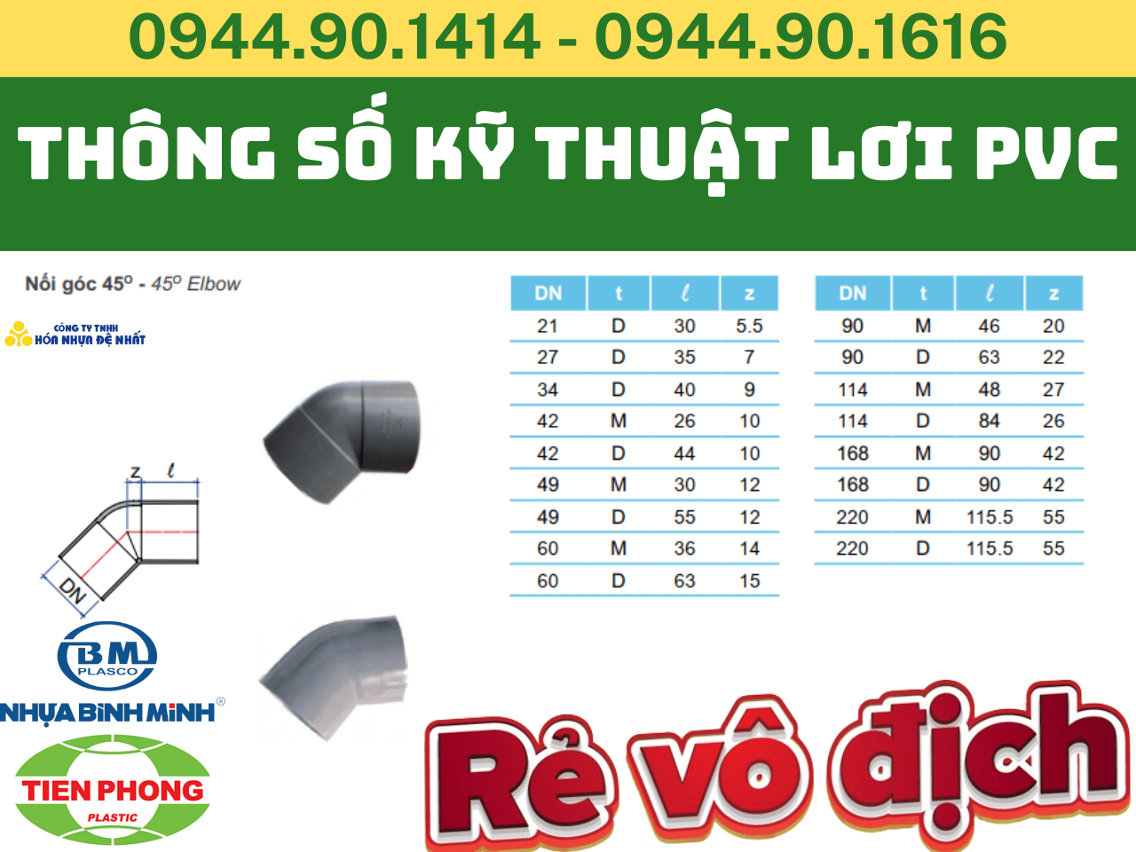 Lơi Nhựa PVC D220 l Chếch PVC l Cút Góc 45° PVC