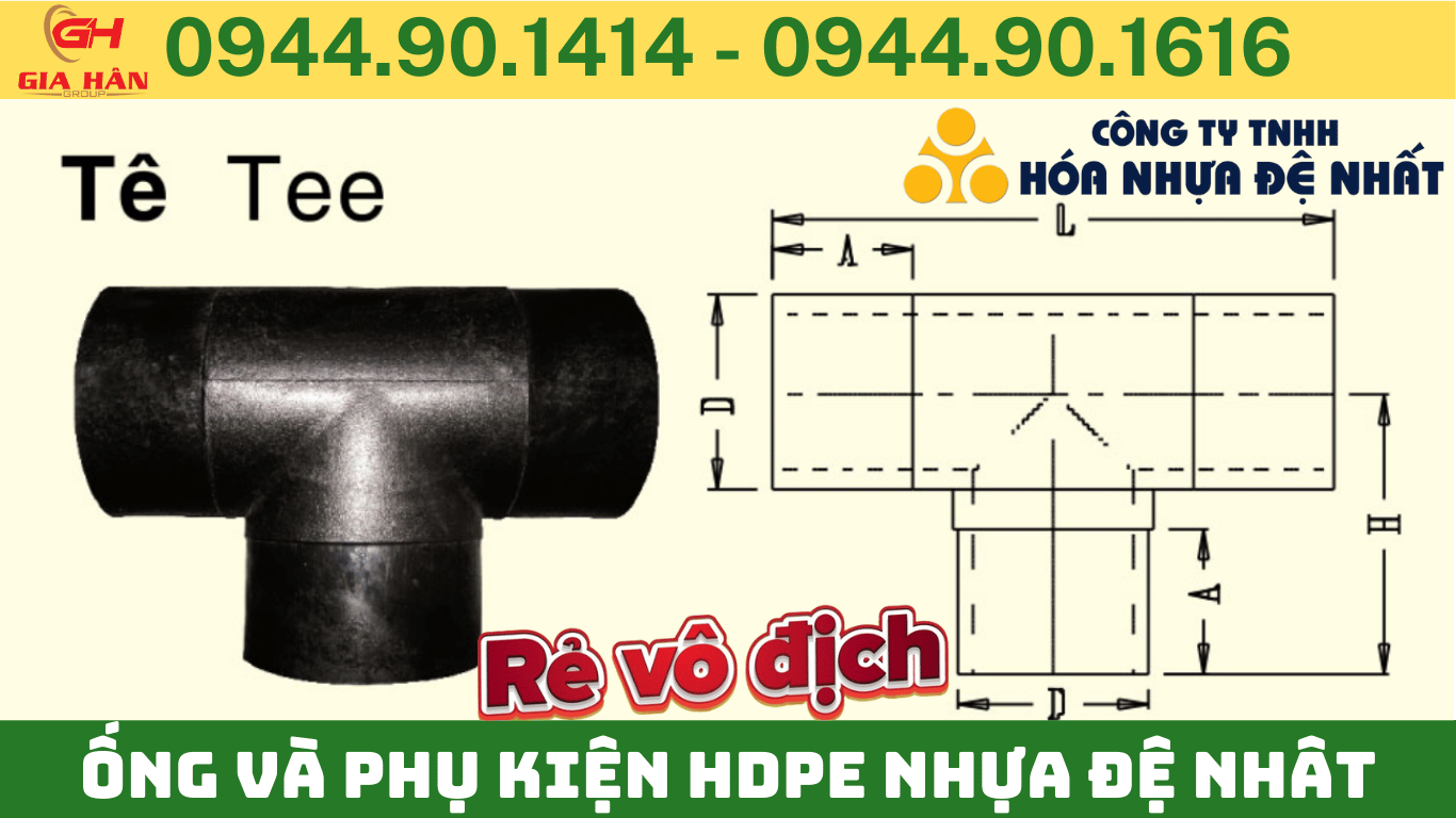- Tê HDPE Đệ Nhất là phụ kiện đường ống được làm từ hạt nhựa HDPE (High-Density Polyethylene) nguyên sinh, do công ty Nhựa Đệ Nhất sản xuất. Sản phẩm này có hình dạng chữ "T" với ba đầu nối, cho phép chia đường ống chính thành hai đường ống phụ hoặc kết nối một đường ống nhánh vào đường ống chính. Nhờ vật liệu HDPE, tê Đệ Nhất có khả năng chịu áp lực, chống ăn mòn hóa học và tuổi thọ lên đến 50 năm.