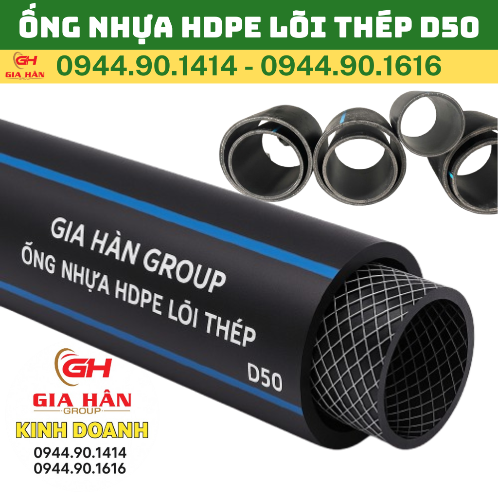 - Ống nhựa HDPE lõi thép D50 (còn gọi là Ống Composite HDPE lõi thép D50) là một loại ống dẫn hiện đại, được cấu tạo từ hai vật liệu chính: lớp nhựa HDPE (High-Density Polyethylene) bên ngoài và một lớp lưới/khung thép carbon xoắn cường lực nằm ở lớp lõi giữa.