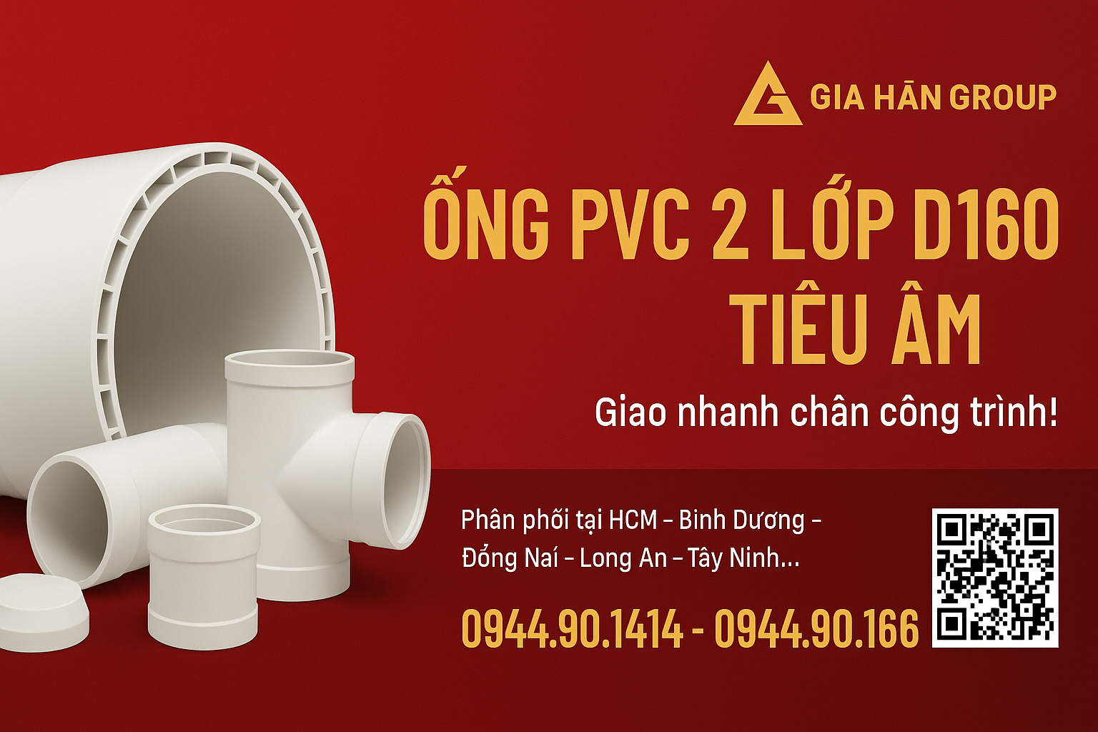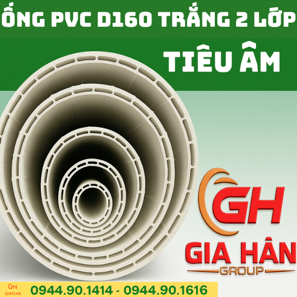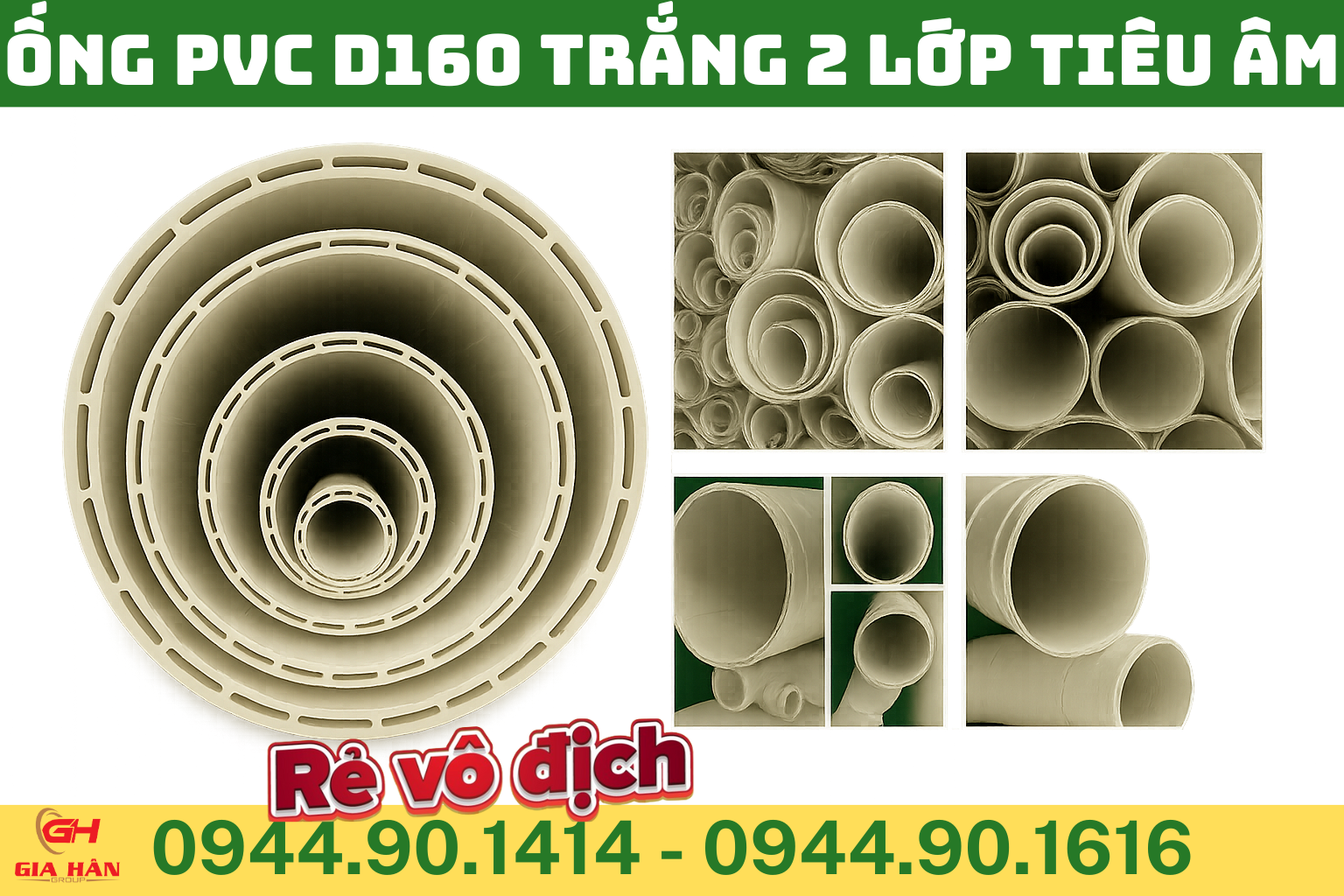- Ống PVC 2 lớp D160 tiêu âm là loại ống nhựa được thiết kế với cấu trúc hai lớp đồng tâm, giúp hấp thụ tiếng ồn và giảm rung động khi nước chảy qua. Lớp ngoài làm từ nhựa PVC cứng chịu va đập, lớp trong có tính năng tiêu âm, giúp giảm tiếng nước chảy rõ rệt so với ống thông thường.