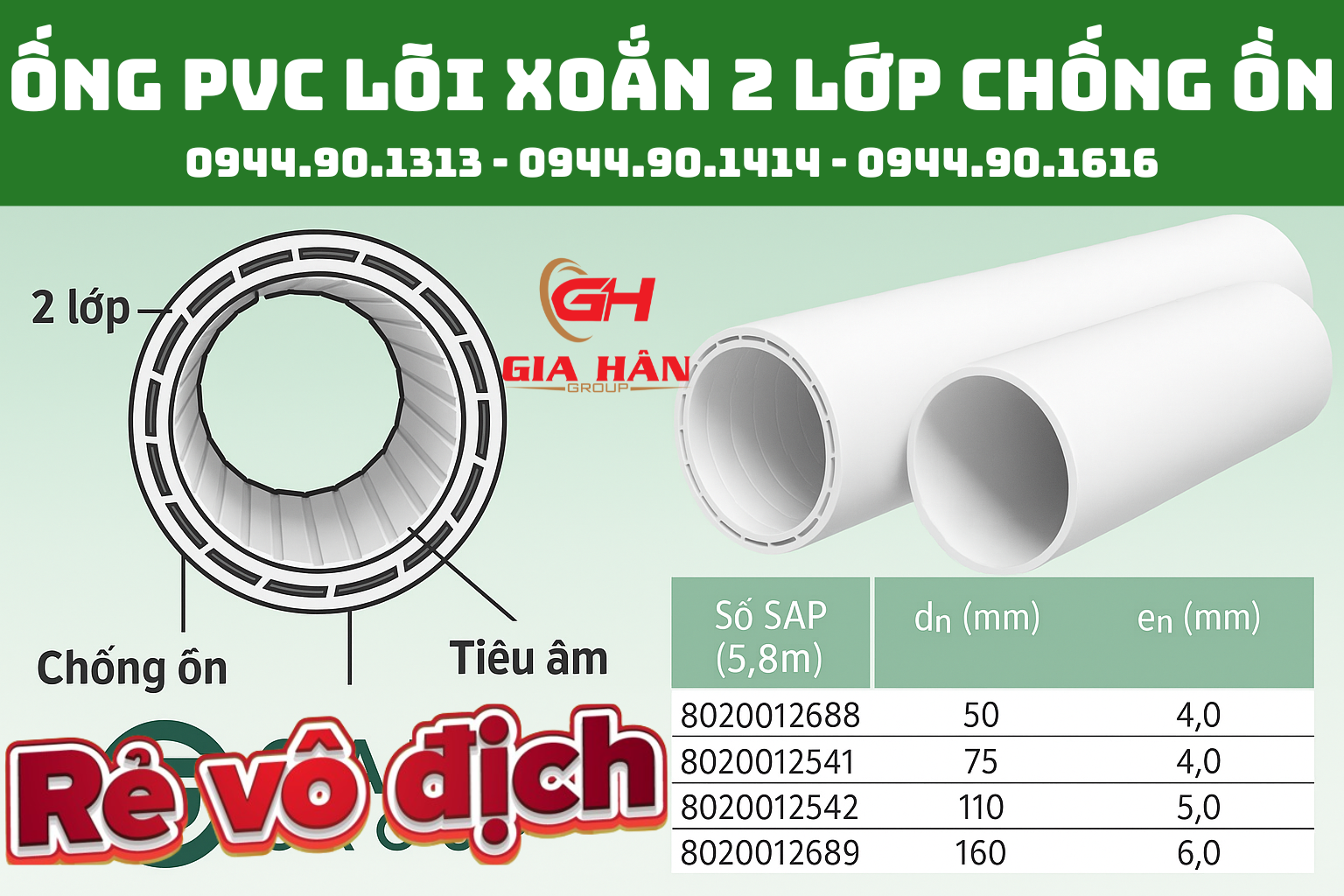 - Hiệu suất Chống Ồn Vượt trội: Giảm đáng kể tiếng ồn của nước chảy, tiếng xả từ bồn cầu so với ống PVC/uPVC đơn lớp. Cải thiện chất lượng sống trong các căn hộ, khách sạn.