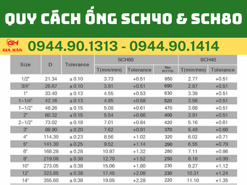 - Độ dày thành ống: Theo tiêu chuẩn SCH80, độ dày này sẽ lớn hơn so với ống SCH40 cùng kích thước, đảm bảo khả năng chịu áp lực cao.