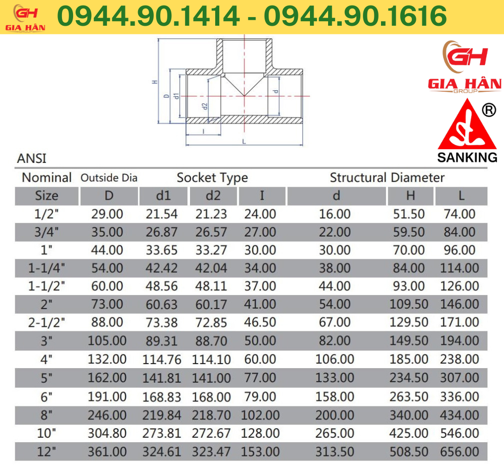 - Kích thước của tê được đo bằng đường kính danh nghĩa (Nominal Pipe Size - NPS), thường dao động từ 1/2 inch đến 12 inch hoặc lớn hơn. Các kích thước phổ biến nhất bao gồm: