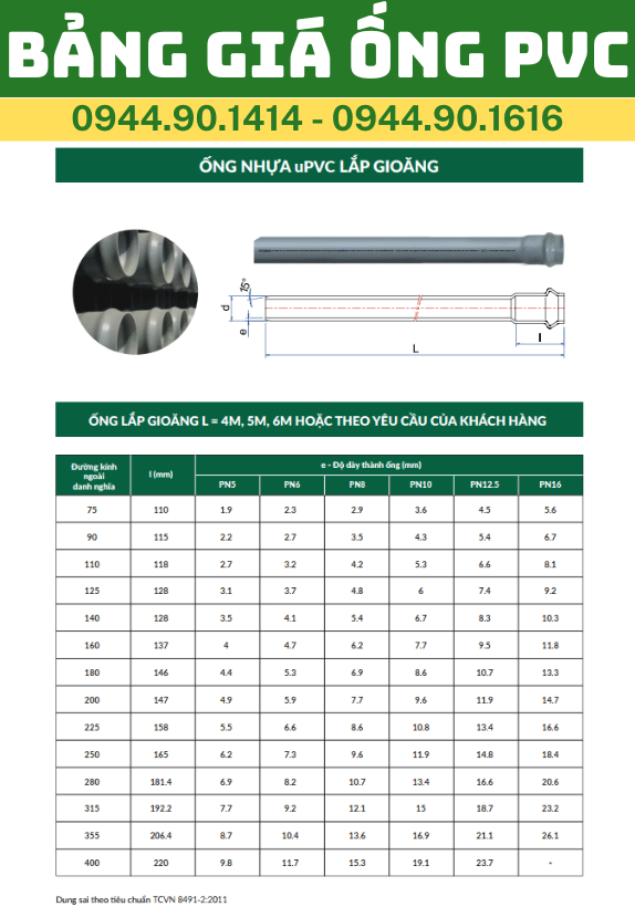 - Thông tin về đường kính, PN, tiêu chuẩn sản xuất (VD: TCVN 8491) được in đầy đủ.