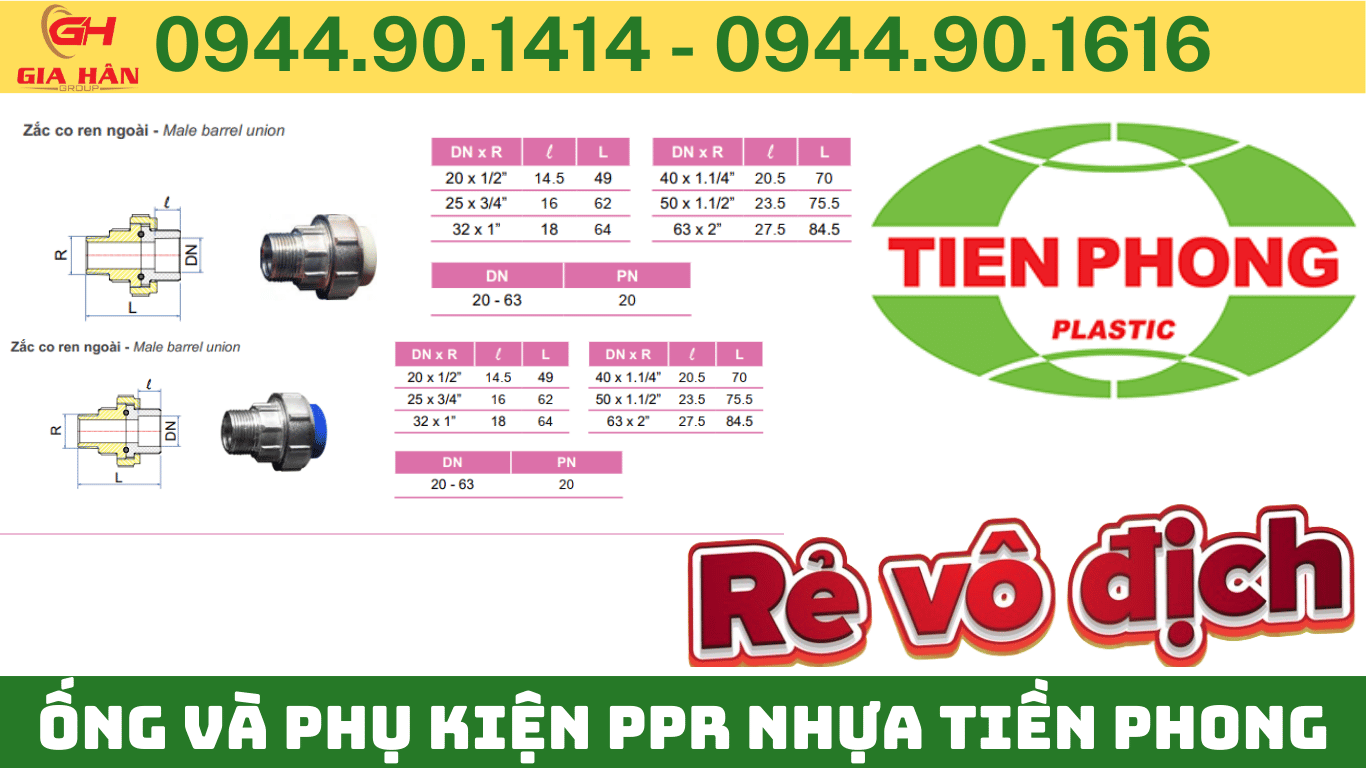 - Rắc co ren ngoài PPR Tiền Phong là một loại phụ kiện dùng để nối hai đoạn ống nhựa PPR hoặc nối ống PPR với các thiết bị khác như van, vòi nước… Sản phẩm có một đầu trơn để hàn nhiệt vào ống PPR và một đầu ren ngoài để kết nối với các phụ kiện ren trong.