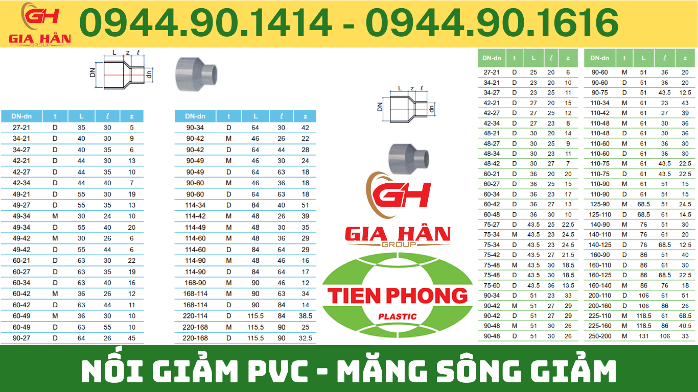 - Nối giảm Tiền Phong được sản xuất theo cả hệ mét và hệ inch, đáp ứng nhu cầu đa dạng của các công trình. Các quy cách phổ biến bao gồm: