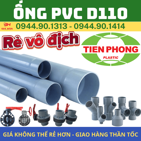 - Giá ống nhựa PVC D110 Tiền Phong phụ thuộc vào kích thước, độ dày và áp lực, số lượng và địa điểm giao hàng từ đó Gia Hân Group sẽ báo giá cụ thể. Giá bán so với các thương hiệu khác thì Ống 110 Tiền Phong vẫn đảm bảo chất lượng và giá