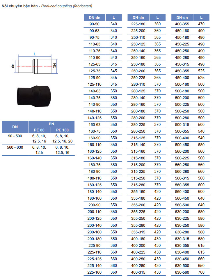 - BẢNG THÔNG SỐ KỸ THUẬT VÀ KÍCH THƯỚC NỐI GIẢM HDPE HÀN ĐỐI ĐẦU TIỀN PHONG