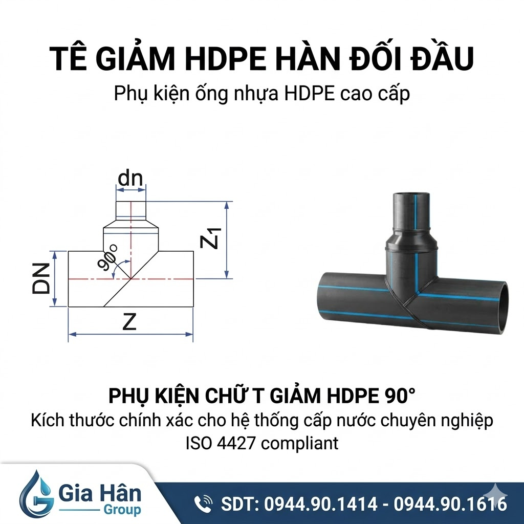 - Tê giảm hàn HDPE là loại phụ kiện HDPE Tiền Phong có dạng hình chữ T được sử dụng để kết nối ba đoạn ống lại với nhau, trong đó hai đầu nằm trên trục chính có đường kính bằng nhau và một đầu nhánh có đường kính nhỏ hơn (giảm cấp). Phương pháp kết nối chủ yếu là hàn đối đầu (Butt Fusion), tạo ra mối nối đồng nhất, kín khít và bền vững như chính thân ống. Phương pháp này sử dụng nhiệt để làm chảy các đầu ống và phụ kiện, sau đó ép chặt để tạo mối nối kín khít, chịu áp lực cao mà không cần keo dán hoặc ren siết.
