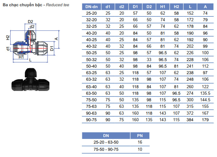 BẢNG THÔNG SỐ KỸ THUẬT TÊ GIẢM HDPE TIỀN PHONG - TÊ THU HDPE - BA CHẠC GIẢM HDPE