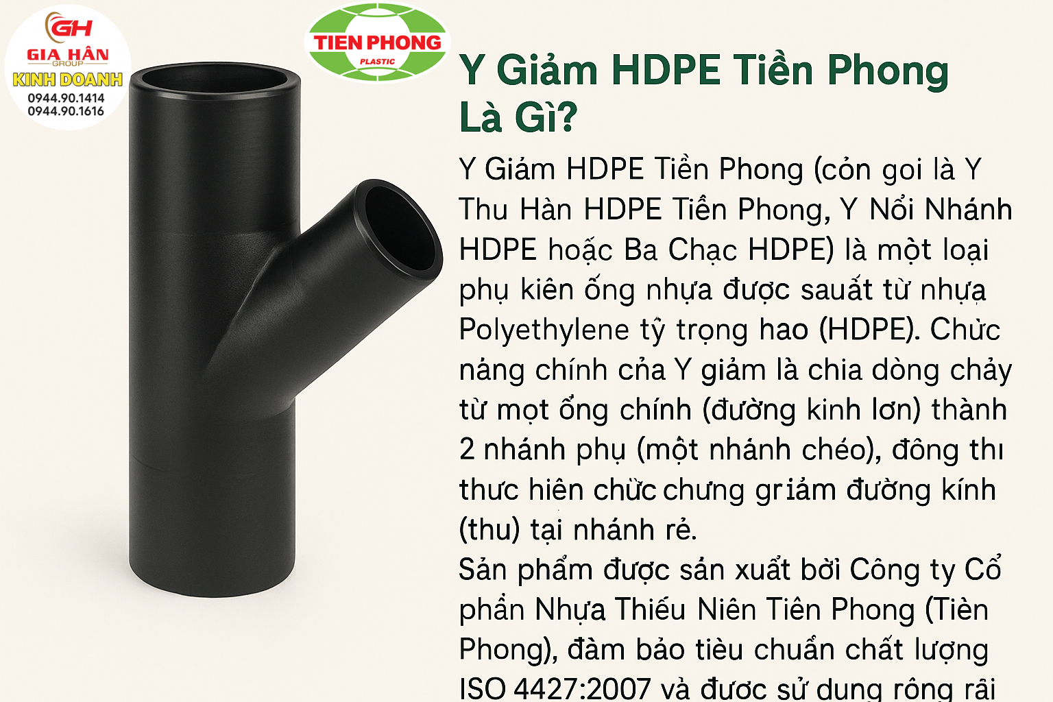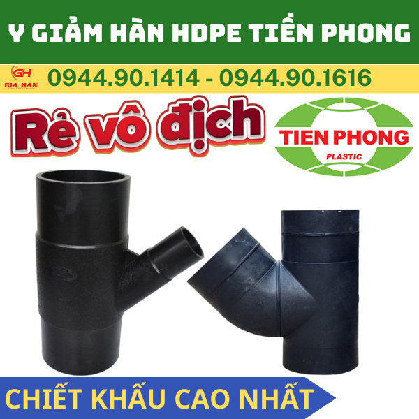 - Y Giảm HDPE Tiền Phong (còn gọi là Y Thu Hàn HDPE Tiền Phong, Y Nối Nhánh HDPE hoặc Ba Chạc HDPE) là một loại phụ kiện ống nhựa được sản xuất từ nhựa Polyethylene tỷ trọng cao (HDPE). Chức năng chính của Y giảm là chia dòng chảy từ một ống chính (đường kính lớn) thành hai nhánh phụ (một nhánh thẳng và một nhánh chéo), đồng thời thực hiện chức năng giảm đường kính (thu) tại nhánh rẽ.