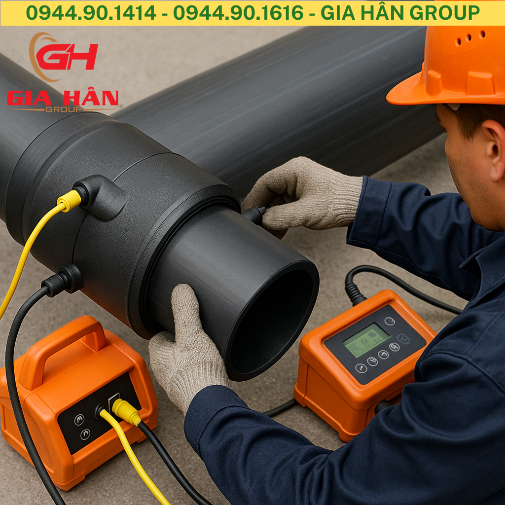 - Lắp phụ kiện electrofusion, kết nối điện (thường 40V, 20-30 giây), làm nguội tự nhiên. Kiểm tra bằng mã vạch nếu máy tự động.
