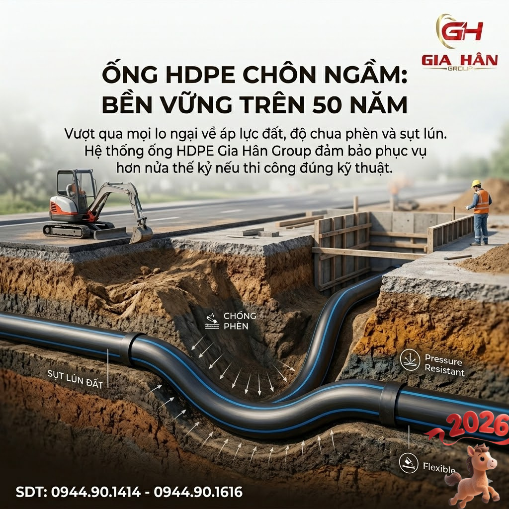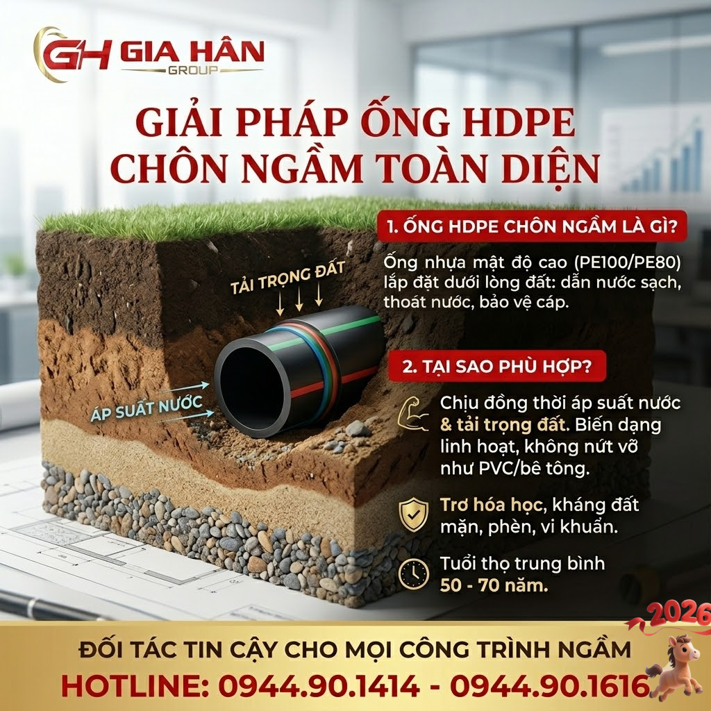 Trong các công trình hạ tầng cấp thoát nước hiện nay, ống HDPE chôn ngầm gần như là lựa chọn "mặc định". Tuy nhiên, không ít chủ đầu tư vẫn lo ngại về việc liệu áp lực đất, độ chua của phèn hay sự sụt lún có làm đường ống bị nứt vỡ sau vài năm sử dụng hay không. Thực tế, nếu thi công đúng tiêu chuẩn kỹ thuật, một hệ thống ống HDPE âm đất có thể "phục vụ" tốt trong hơn nửa thế kỷ.