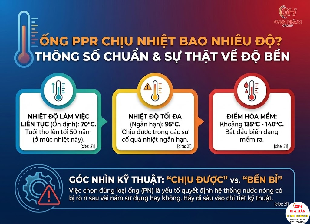 - Trả lời: Về lý thuyết vật liệu, ống PPR chịu được nhiệt độ hóa mềm lên tới 135°C. Tuy nhiên, nước sôi 100°C đi kèm áp suất hơi nước cao sẽ vượt quá giới hạn an toàn thiết kế của ống. Không nên dùng ống PPR để dẫn hơi nước bão hòa hoặc nước đang sôi sùng sục liên tục.