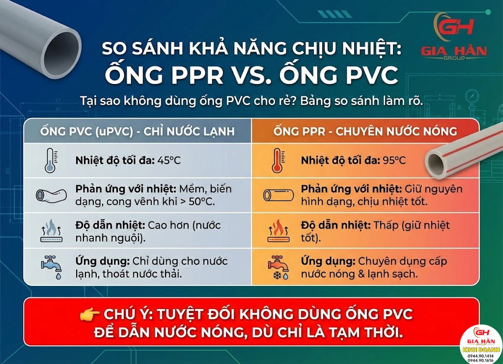 - 👉 Chú Ý: Tuyệt đối không dùng ống PVC để dẫn nước nóng, dù chỉ là tạm thời.