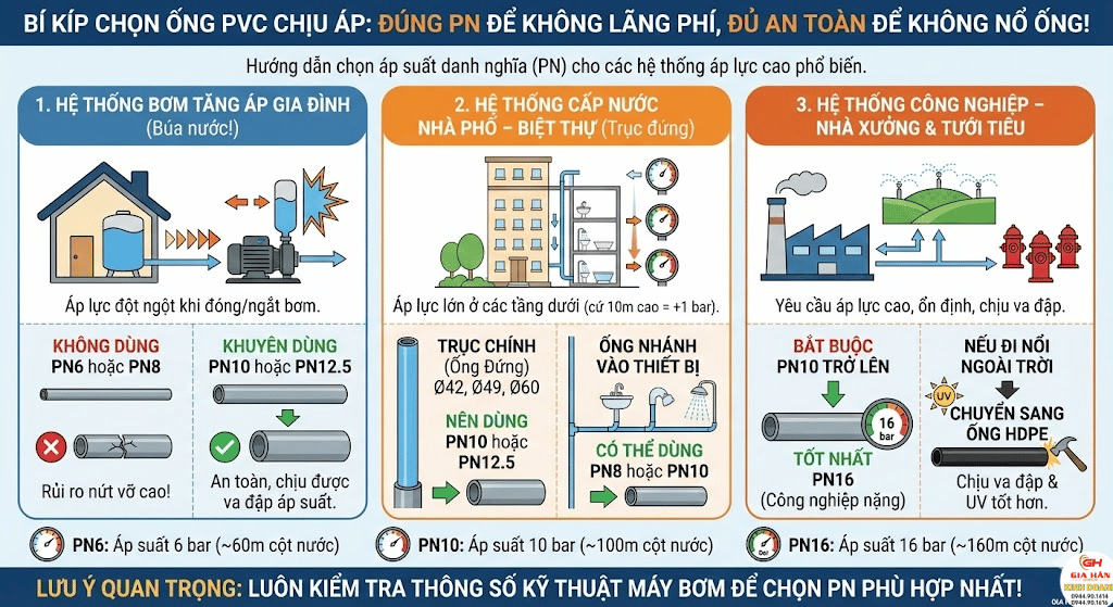 - Không nên dùng PN6 hoặc PN8 cho đoạn ống ngay sau máy bơm tăng áp vì rủi ro nứt vỡ theo thời gian là rất cao.