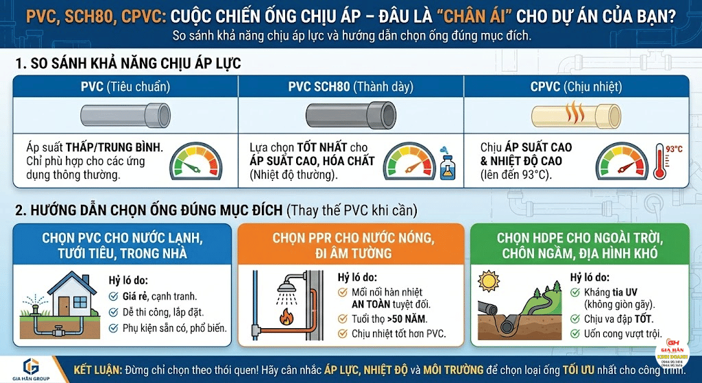 - PVC tiêu chuẩn không phải lúc nào cũng là lựa chọn tối ưu. Tùy vào áp lực và môi trường, bạn nên cân nhắc các vật liệu chuyên dụng sau: