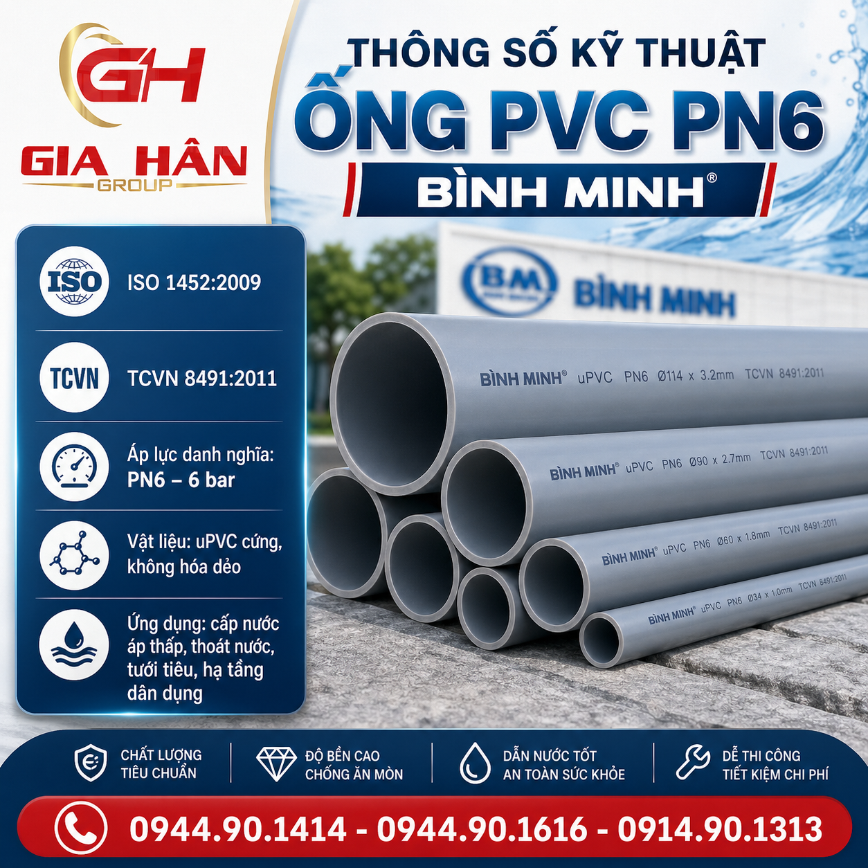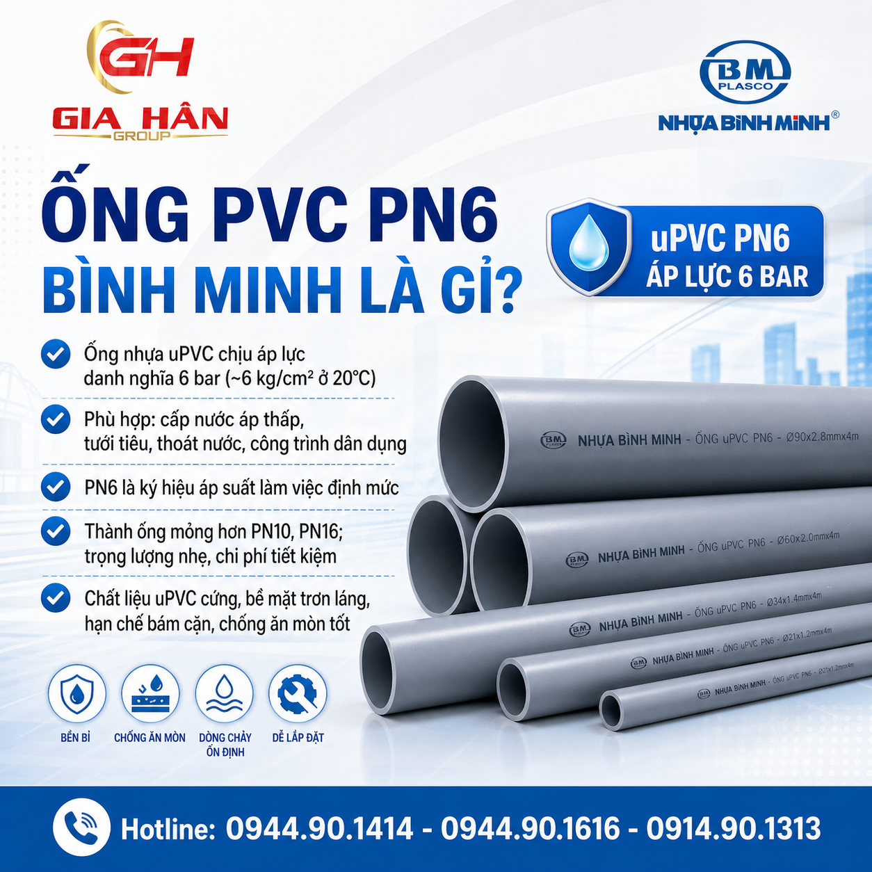 - Ống PVC PN6 Bình Minh là dòng ống nhựa uPVC chịu áp lực danh nghĩa 6 bar, tương đương khoảng 6 kg/cm² ở 20°C. Đây là nhóm ống áp lực thấp – trung bình, thường dùng cho hệ thống cấp nước áp thấp, tưới tiêu, thoát nước và công trình dân dụng.