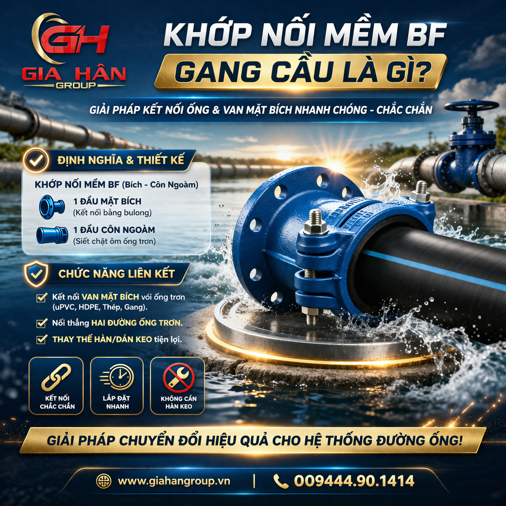 - Khớp nối mềm BF (hay còn được gọi là mối nối BF, ngàm BF) là một phụ kiện chuyên dụng trong ngành nước được đúc nguyên khối từ gang. Đặc điểm nhận diện cốt lõi của sản phẩm này nằm ở thiết kế bất đối xứng: một mặt kết nối là mặt bích (để bắt bulong), một mặt kết nối theo kiểu dạng côn ngoàm (để siết chặt ôm lấy thân ống).