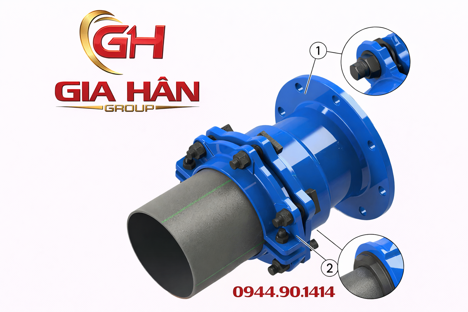 - Thân khớp nối: Sản xuất bằng vật liệu chính là gang cầu (Ductile Iron - FCD). Chất liệu này kết hợp hoàn hảo những đặc tính ưu việt nhất: mang độ dẻo của thép giúp không gây đứt gãy dưới áp lực, và giữ được đặc tính của gang như ít bị ăn mòn, hấp thụ tiếng ồn tốt và độ bền cao. Thân gang được phủ sơn Epoxy màu xanh đặc trưng để chống gỉ sét ngoài trời.